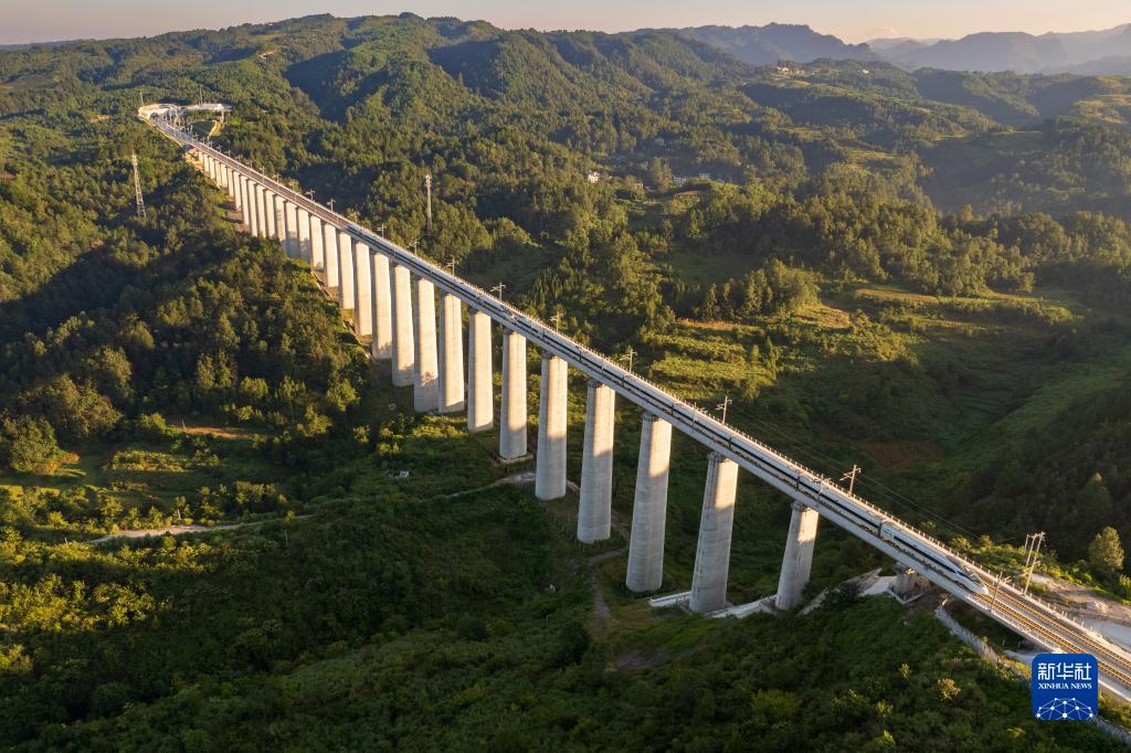 8月31日,一列動(dòng)車(chē)組在晨曦中經(jīng)過(guò)位于貴州省獨山縣郊外的貴南高鐵銀坡河特大橋(無(wú)人機照片)。