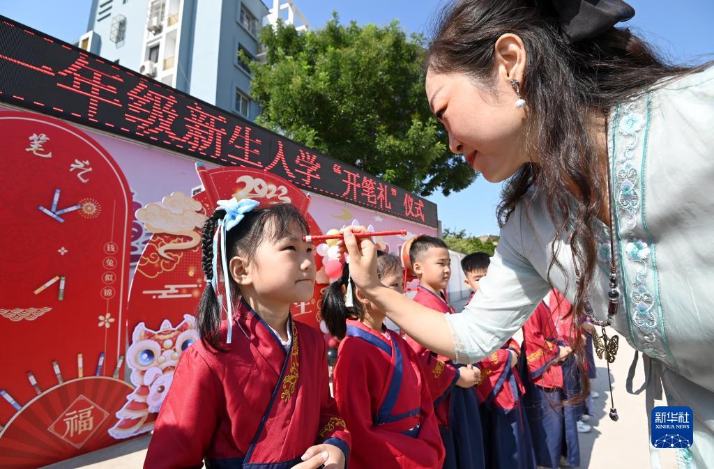 8月31日,河北省邯鄲市峰峰礦區滏北小學(xué)的老師在“開(kāi)筆禮”儀式上給一年級新生點(diǎn)朱砂。