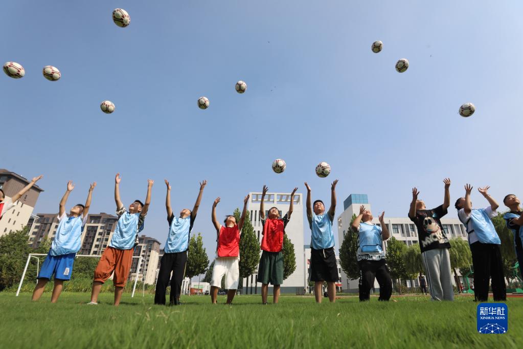 8月31日,河南省焦作市溫縣第四實(shí)驗小學(xué)學(xué)生在體育課上學(xué)習足球技能。