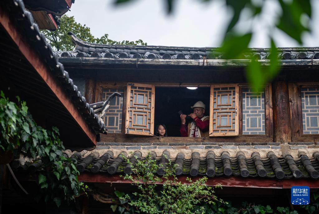 麗江市玉龍納西族自治縣白沙鎮玉湖村村民和杰林(右)在自家的納西文化體驗館為游客展示吹牛角號(8月28日攝)。