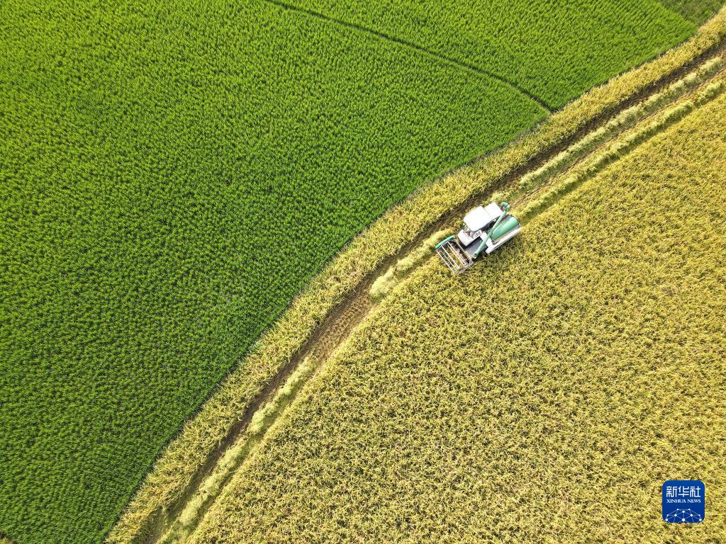 8月30日,在湖南省婁底市雙峰縣井字鎮花橋村,農民駕駛農機收割稻谷(無(wú)人機照片)。