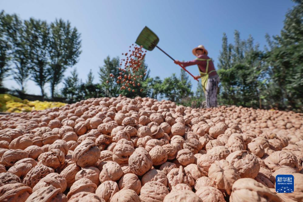 8月30日,河北省遵化市東舊寨鎮農民在晾曬核桃。