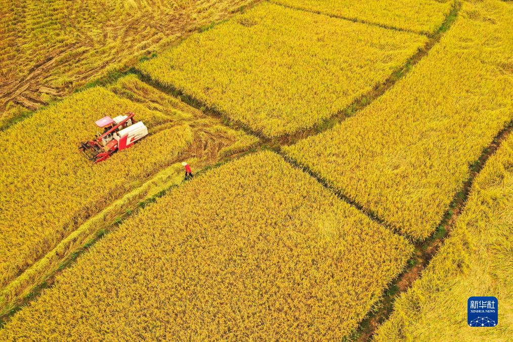 8月31日,湖南省常寧市羅橋鎮陽(yáng)家村村民駕駛收割機在收割水稻(無(wú)人機照片)。