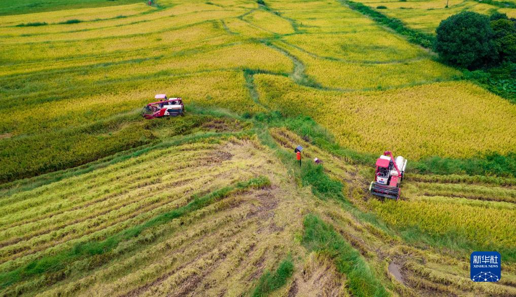 8月31日,在江西省新余市仙女湖區白田村,農戶(hù)駕駛農機收獲第一季再生稻(無(wú)人機照片) 。