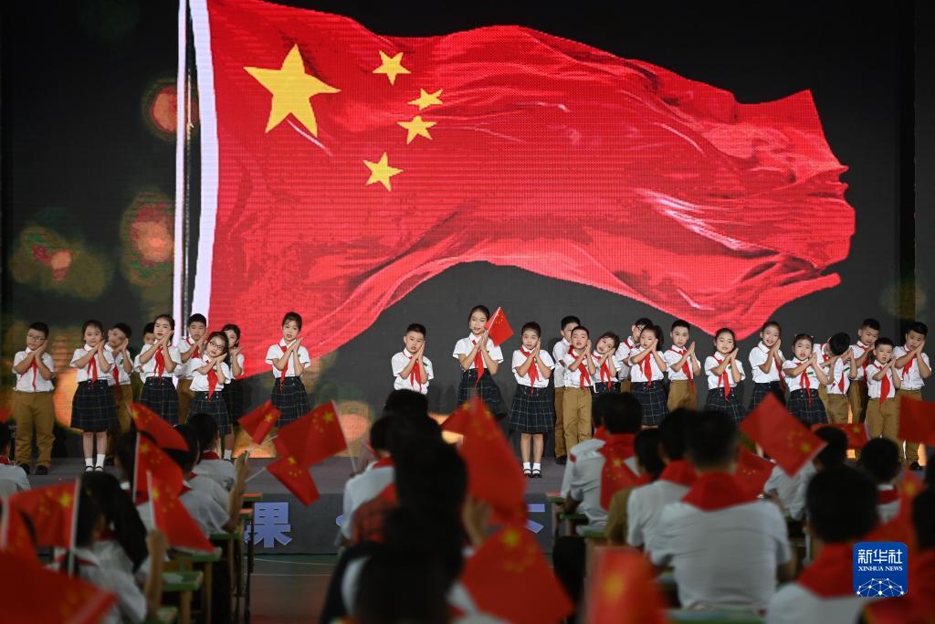 9月1日,浙江省寧波市奉化區錦屏中心小學(xué)的學(xué)生在活動(dòng)上表演童聲合唱《國旗國旗真美麗》。