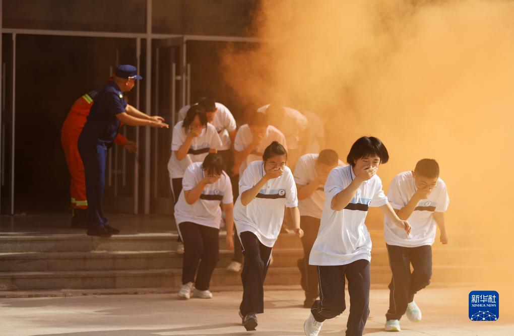 9月1日,山東省臨沂市郯城縣消防救援大隊消防救援人員在育才中學(xué)開(kāi)學(xué)第一課上,指導學(xué)生開(kāi)展火場(chǎng)逃生疏散演練。