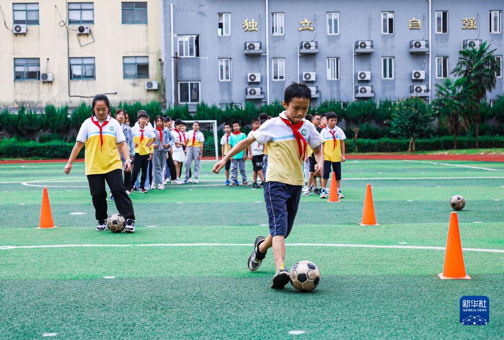9月1日,浙江省湖州市吳興區東林鎮東林二小的學(xué)生們在“開(kāi)學(xué)第一課”上參加足球繞樁比賽。
