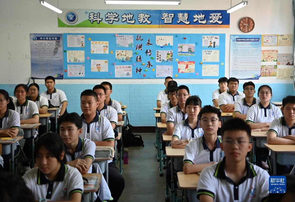 9月1日,天津市靜海區實(shí)驗中學(xué)學(xué)生在開(kāi)學(xué)第一課上聽(tīng)老師講述抗洪故事。