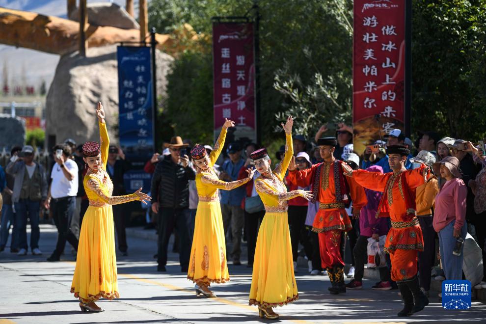 在新疆塔什庫爾干塔吉克自治縣帕米爾旅游區游客服務(wù)中心,文工團演員跳舞歡迎游客(8月29日攝)。