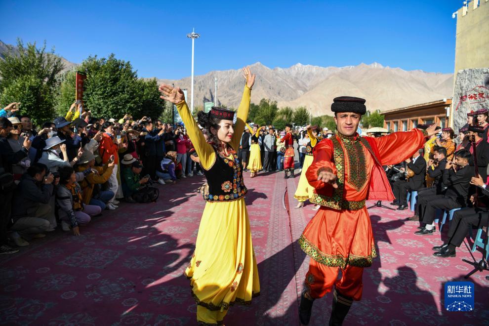 在新疆塔什庫爾干塔吉克自治縣帕米爾旅游區游客服務(wù)中心,文工團演員跳舞歡迎游客(8月31日攝)。
