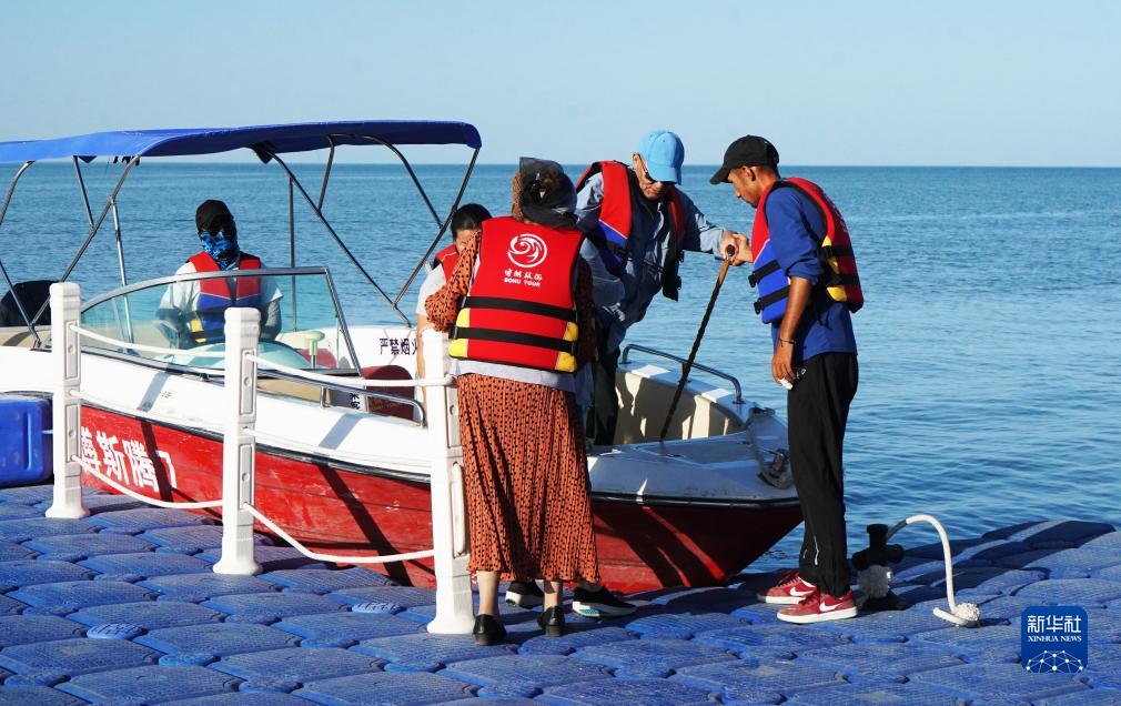 8月31日,在新疆博斯騰湖大河口景區,工作人員幫助乘坐游艇的游客下船。