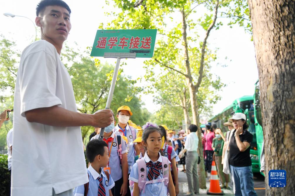 9月1日,在北京市豐臺區第一小學(xué)外,乘坐通學(xué)公交車(chē)到達的學(xué)生在老師的指引下排隊等候入校。