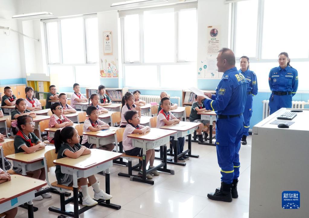 9月1日,在北京市門(mén)頭溝區京師實(shí)驗小學(xué),門(mén)頭溝區藍天救援隊的隊員們在開(kāi)學(xué)第一課中與學(xué)生交流。