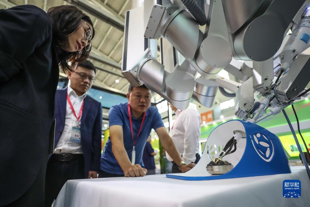 9月1日,參觀(guān)者在第二十一屆中國國際裝備制造業(yè)博覽會(huì )現場(chǎng)參觀(guān)展出的腹腔內窺鏡單孔手術(shù)系統。