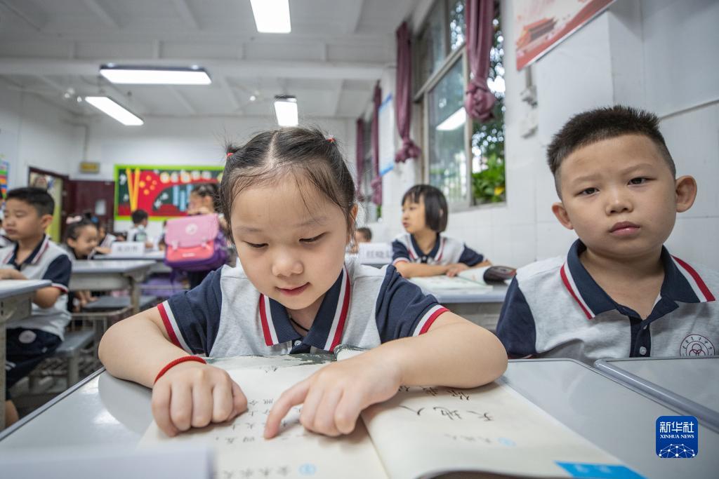 9月1日,在重慶育才實(shí)驗學(xué)校華巖校區,豆豆(前右二)在教室內看書(shū)。