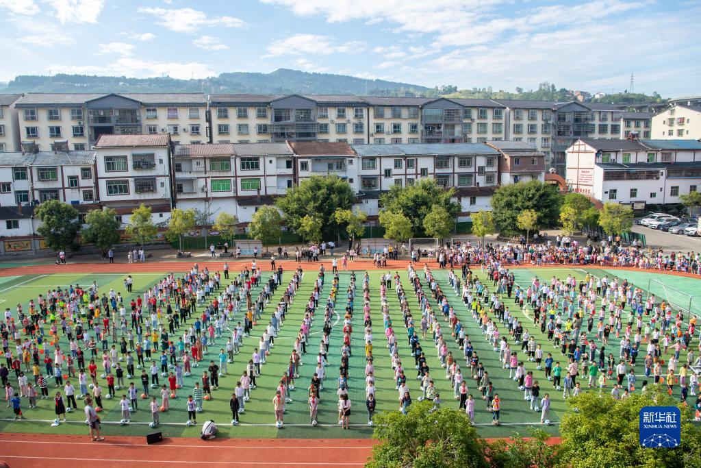 9月1日,在重慶市石柱縣三河鎮的三河小學(xué),學(xué)生和老師參加開(kāi)學(xué)典禮。