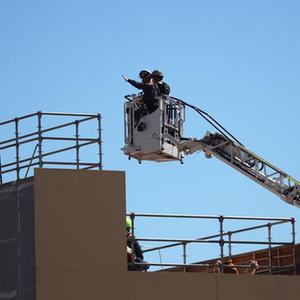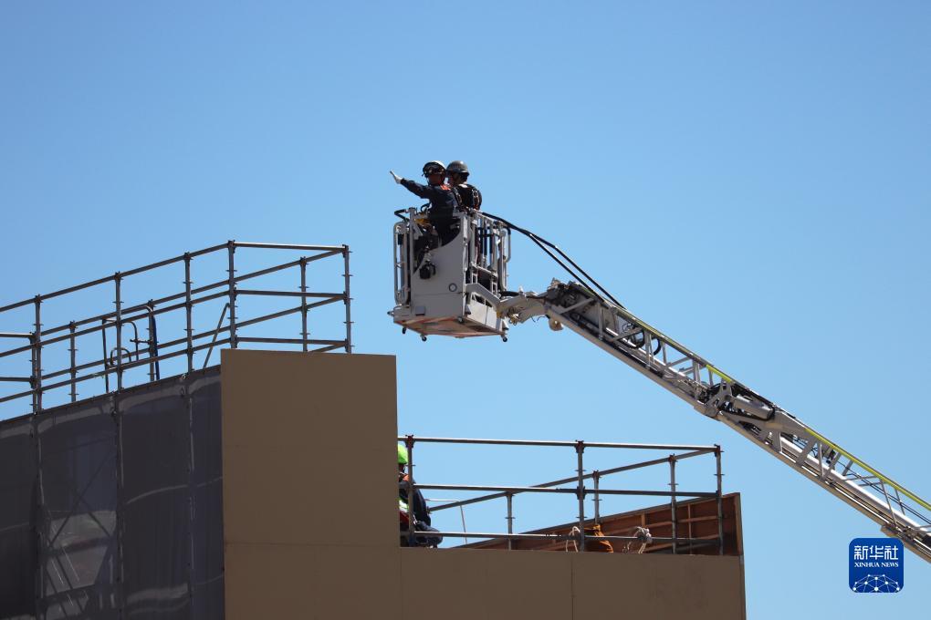 9月1日,在日本神奈川縣相模原市,消防員演練用消防云梯車(chē)救下被困高樓的民眾。