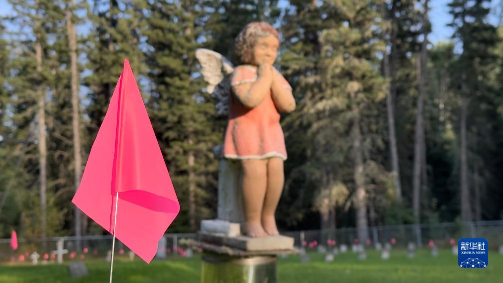 這是8月31日在加拿大薩斯喀徹溫省博瓦爾印第安人寄宿學(xué)校舊址拍攝的用粉色旗子標出的疑似兒童和嬰兒墓地。