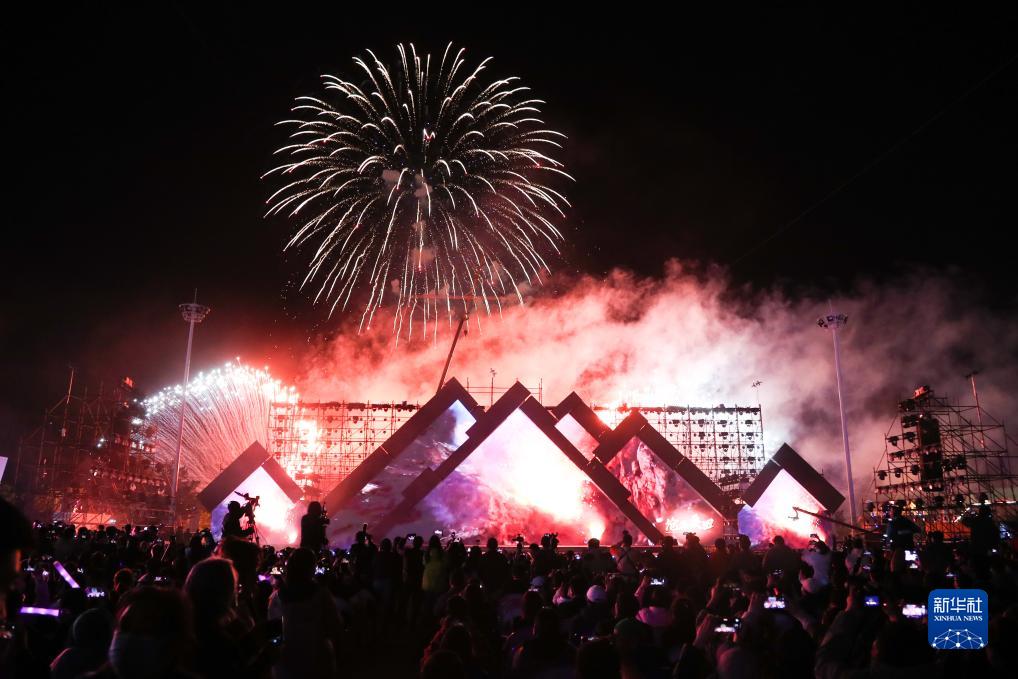 這是9月1日拍攝的晚會(huì )現場(chǎng)焰火表演。