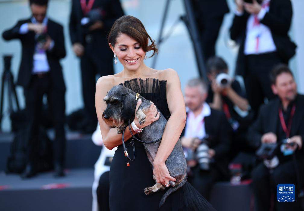 9月1日,在意大利威尼斯,演員卡泰麗娜·穆里諾抱著(zhù)寵物狗亮相電影《可憐的東西》首映式紅毯。