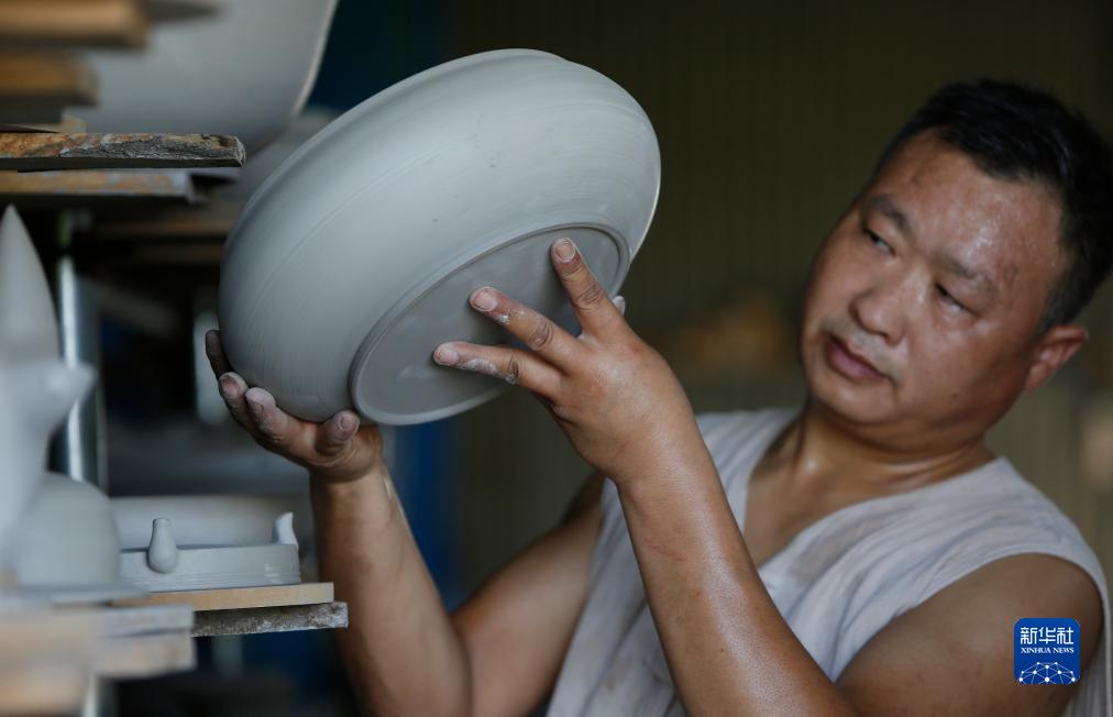 8月31日,在清涼寺村的一家汝瓷生產(chǎn)企業(yè),汝瓷藝人劉國和在車(chē)間里查看素坯。