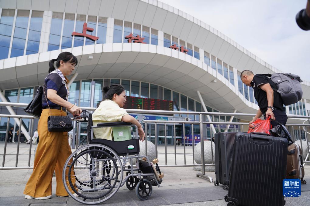 蔣張子怡和父母一起抵達車(chē)站準備乘車(chē)前往山東臨沂(8月31日攝)。