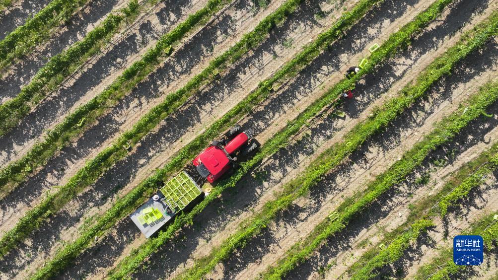 采摘工在位于賀蘭山東麓銀川市西夏區的志輝源石酒莊采摘釀酒葡萄(無(wú)人機照片,9月1日攝)。
