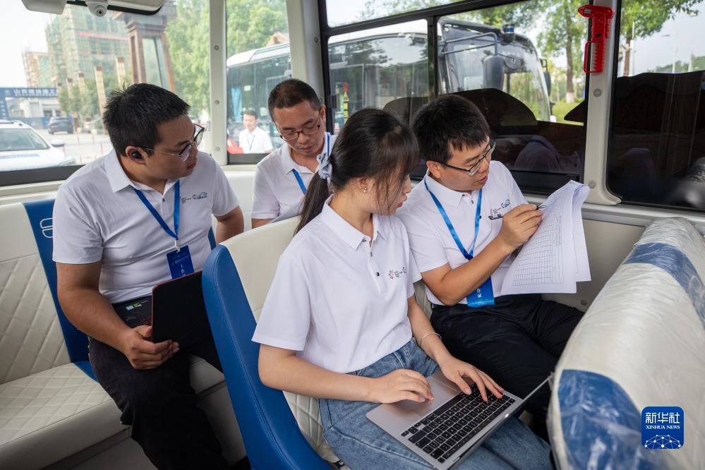 9月2日,在重慶市永川區,裁判在參加L3級/L4級自動(dòng)駕駛公交車(chē)組別賽事的車(chē)輛內核對相關(guān)信息。