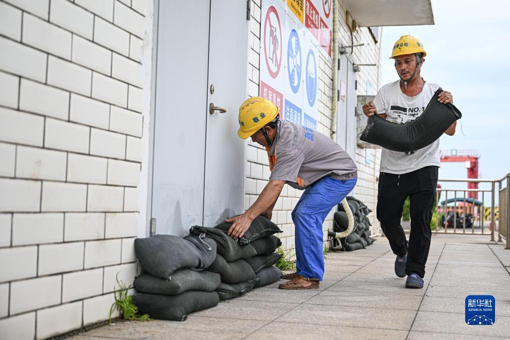 9月2日,工人在海南省??谑行潞8垡惶帣C房門(mén)外放置防汛沙袋。