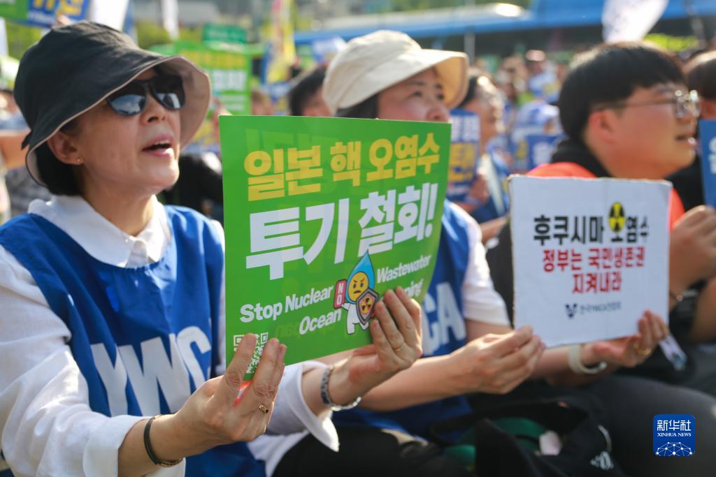 當日,韓國多個(gè)市民團體在首爾市中心舉行集會(huì ),抗議日本核污染水排海。