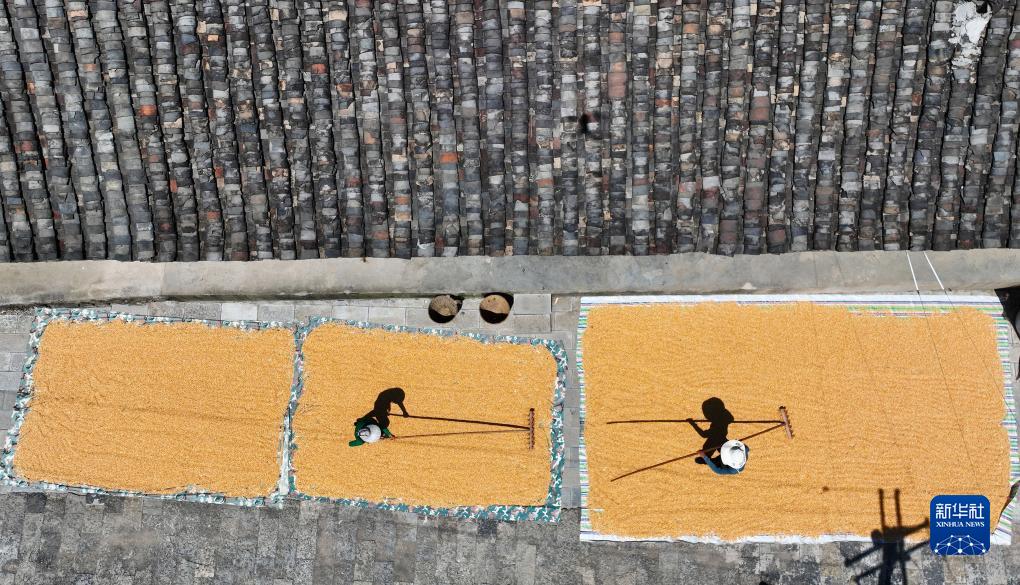 9月2日,在重慶市黔江區金洞鄉鳳臺村葉家大院,村民在晾曬玉米(無(wú)人機照片)。