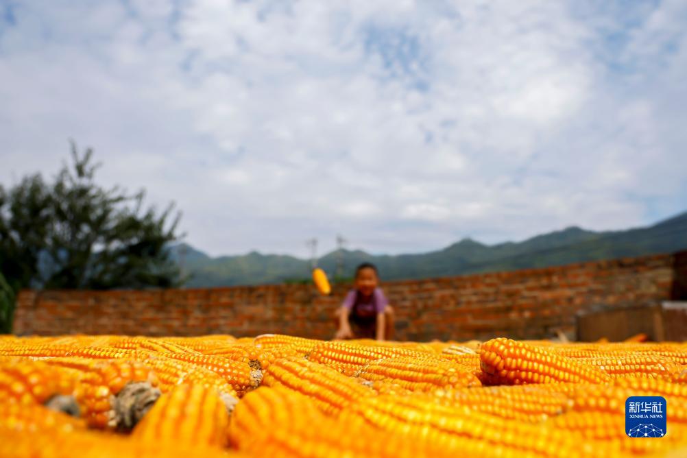 9月2日在貴州省黔南布依族苗族自治州羅甸縣逢亭鎮逢亭村拍攝的晾曬的玉米。