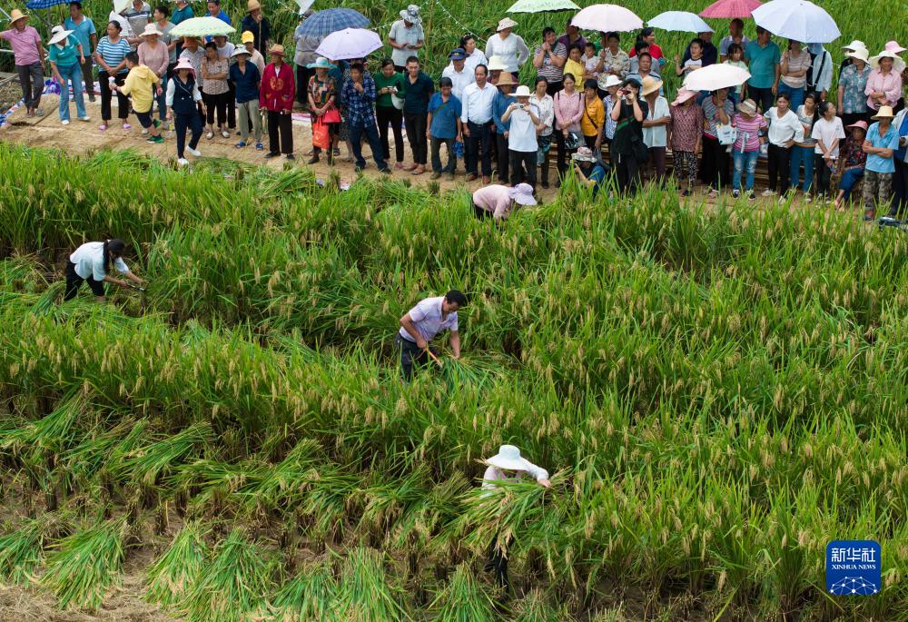 9月2日,在鹽邊縣惠民鎮興隆村的稻田里,來(lái)自惠民鎮的村民在進(jìn)行稻谷收割比賽(無(wú)人機照片)。