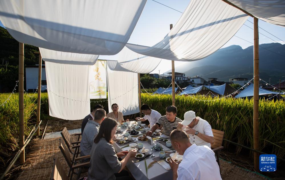 9月2日,在鹽邊縣惠民鎮興隆村的豐收后的稻田里,幾位食客在享用當地傳統美食。
