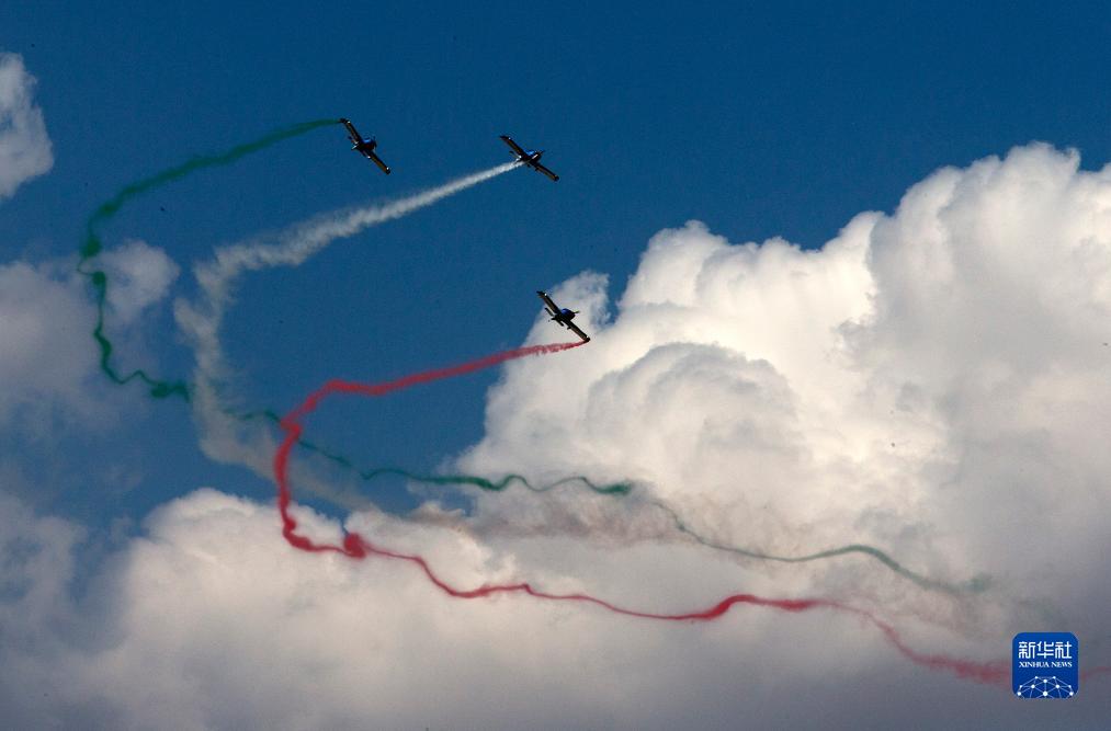 9月2日,在希臘塔納格拉空軍基地的雅典飛行周上,來(lái)自意大利的飛行表演隊進(jìn)行表演。