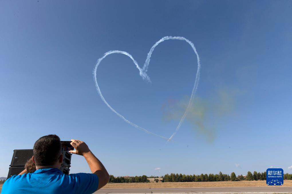 9月2日,一名男子在希臘塔納格拉空軍基地舉行的雅典飛行周上拍攝阿聯(lián)酋飛行表演隊的表演。