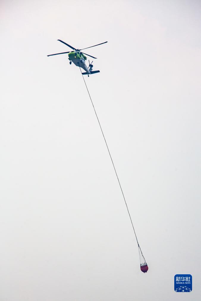 這是9月2日在美國得克薩斯州沃克縣亨茨維爾,消防直升機運水滅火。