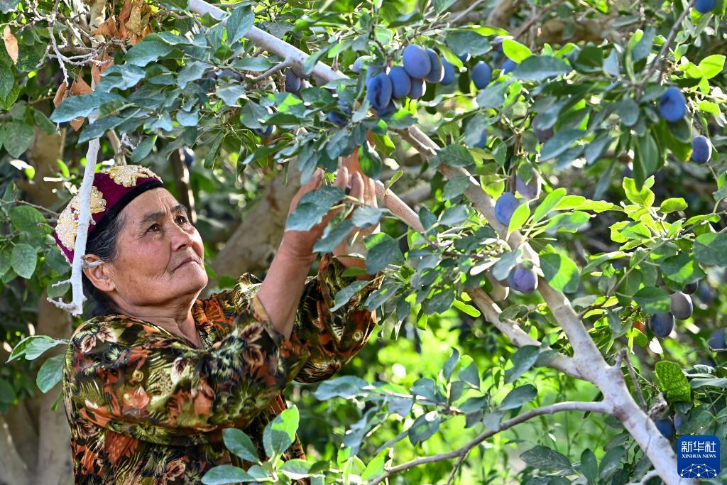 在新疆伽師縣英買(mǎi)里鎮巴格托格拉克村,果農在采摘新梅(8月4日攝)。