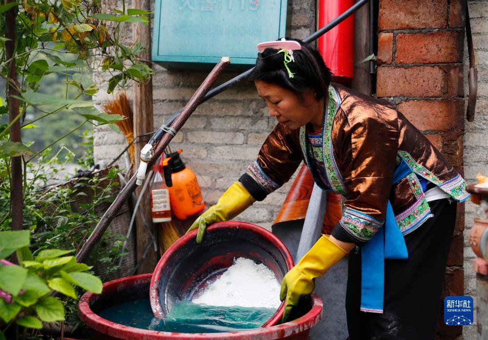 烏英苗寨婦女梁足英用石灰加入藍靛草浸泡水中調制染料(2023年8月31日攝)。新華社記者 胡星宇 攝
