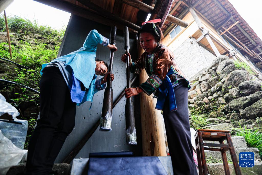 烏英苗寨婦女梁足英(右)在用傳統亮布槌捶打布料(2023年8月31日攝)。新華社記者 胡星宇 攝