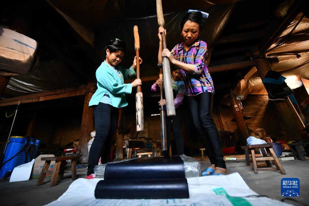 烏英苗寨婦女韋妹麗(右)在用傳統亮布槌捶打布料(2020年9月2日攝)。新華社記者 黃孝邦 攝