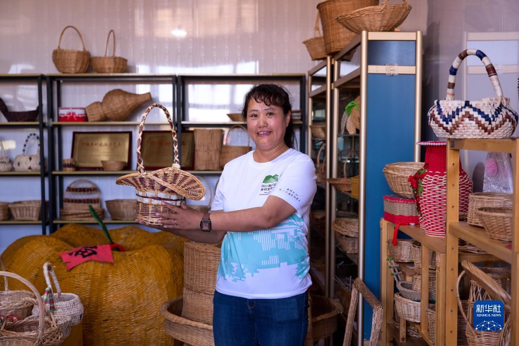 9月2日,阿爾山市西口村村民董亞麗在展示柳編產(chǎn)品。通過(guò)銷(xiāo)售柳編等旅游紀念品,當地村民多了一條增收渠道。