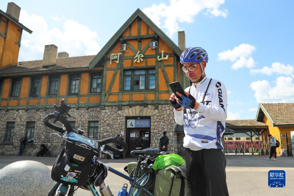 9月1日,一名騎行愛(ài)好者“打卡”阿爾山市火車(chē)站。