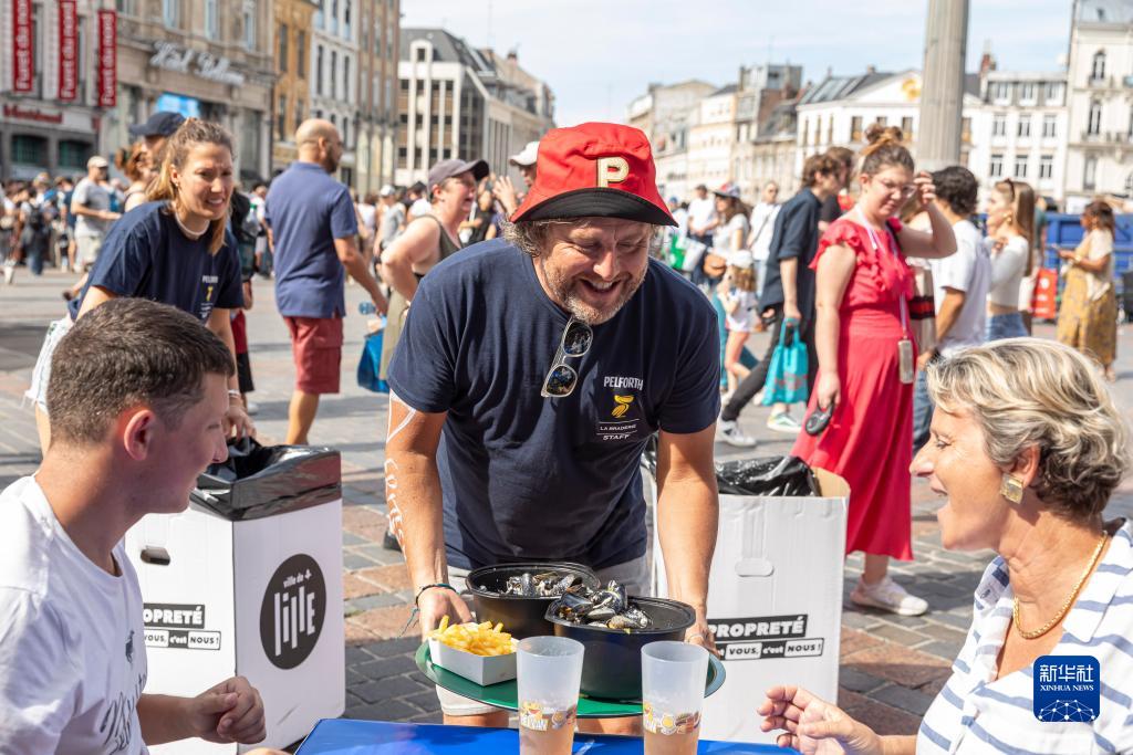 9月3日,在法國里爾舊貨市場(chǎng)上,服務(wù)員為顧客端上新鮮出爐的貽貝。