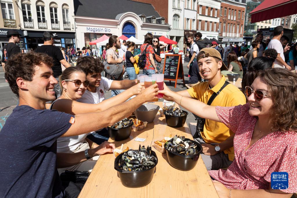 9月3日,在法國里爾舊貨市場(chǎng)上,人們享用貽貝、薯條和啤酒。