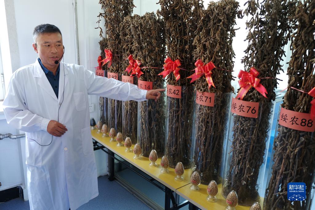 9月3日,黑龍江省農科院綏化分院水稻品種育種所所長(cháng)聶守軍在標本室介紹種植品種情況。