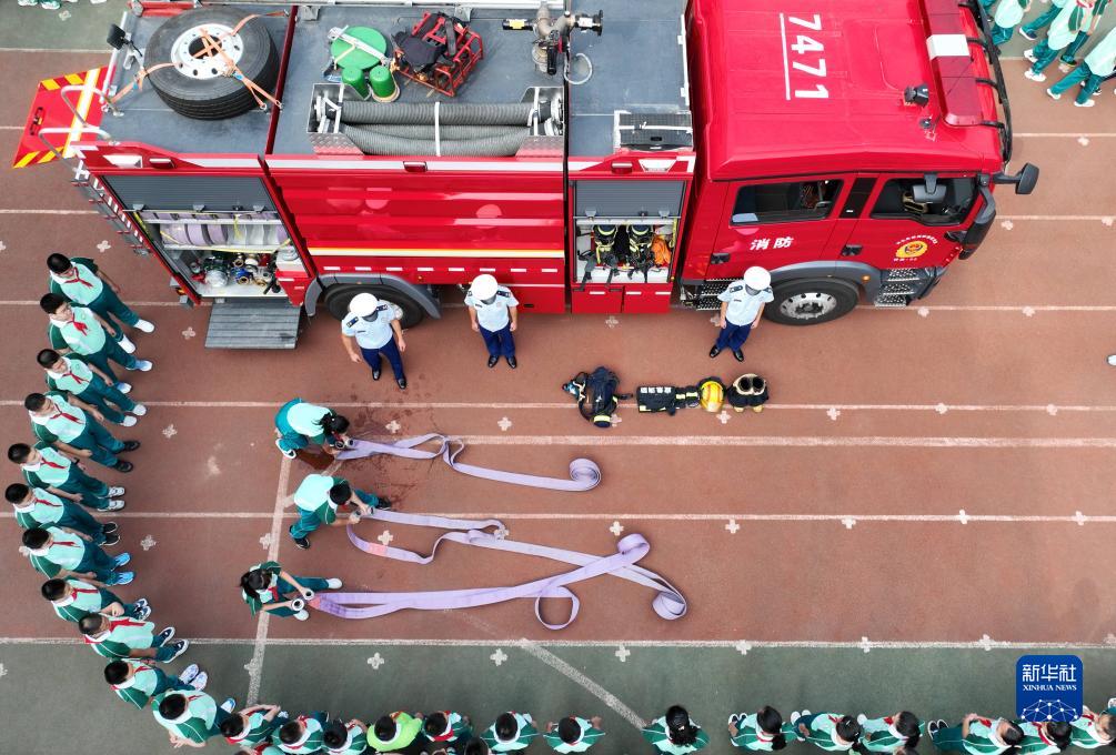 9月4日,承德市雙橋區竹林寺小學(xué)學(xué)生在消防救援隊員指導下體驗使用消防器材(無(wú)人機照片)。