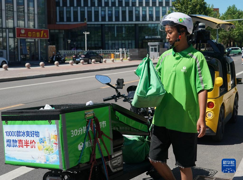 在位于北京市順義區的一處自動(dòng)配送車(chē)指定??奎c(diǎn),一名騎手取走自動(dòng)配送車(chē)中的訂單準備送至顧客手中(8月22日攝)。