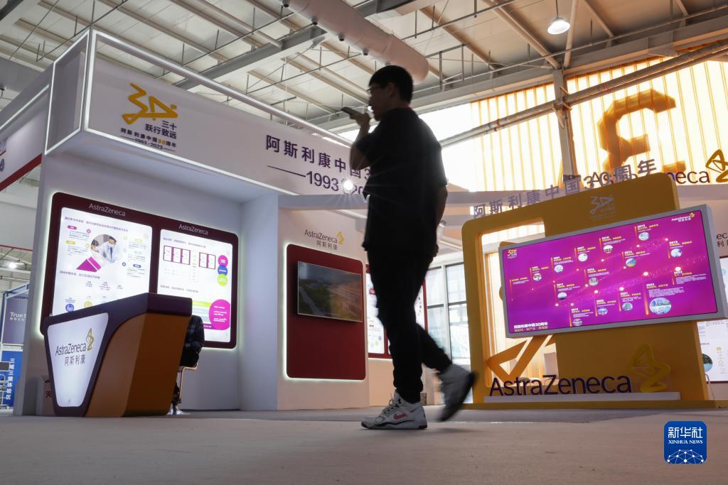 9月4日,參觀(guān)者走過(guò)首鋼園健康衛生服務(wù)展區的阿斯利康展臺。