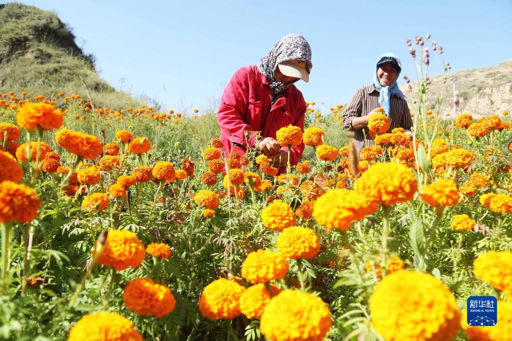 9月4日,農民在甘肅省定西市隴西縣馬河鎮賀家川村采摘萬(wàn)壽菊。